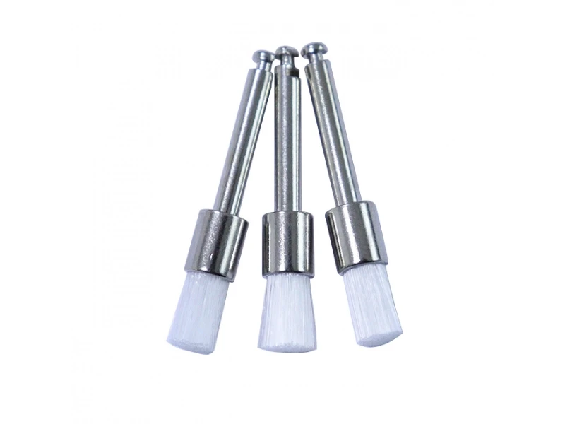 Disposable polishing prophy brushes with a clear nylon tip and metal shank, single use.