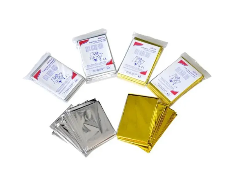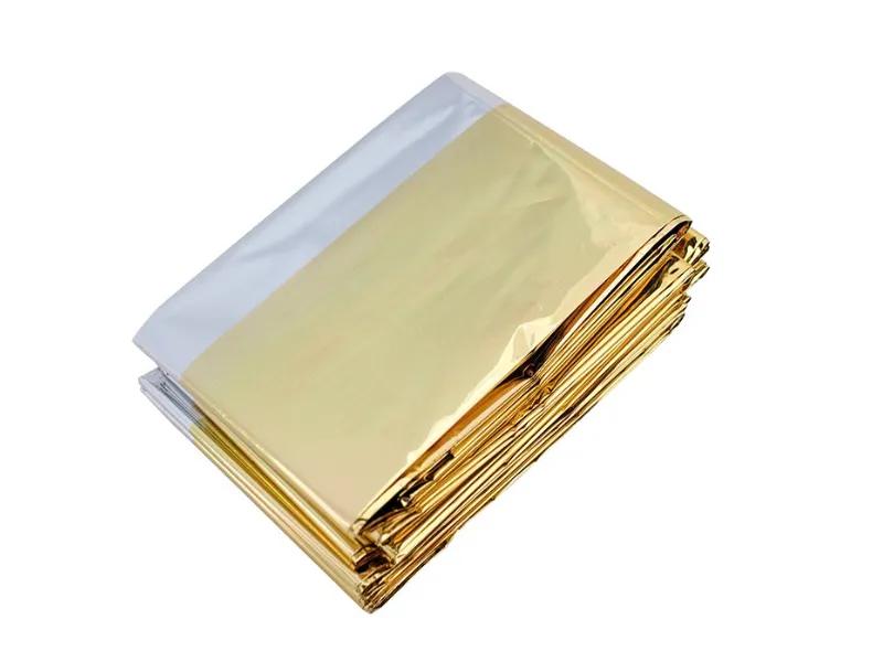 Emergency Blanket is made of durable insulation PET polyester film material, it retains/reflects 90% of body heat.