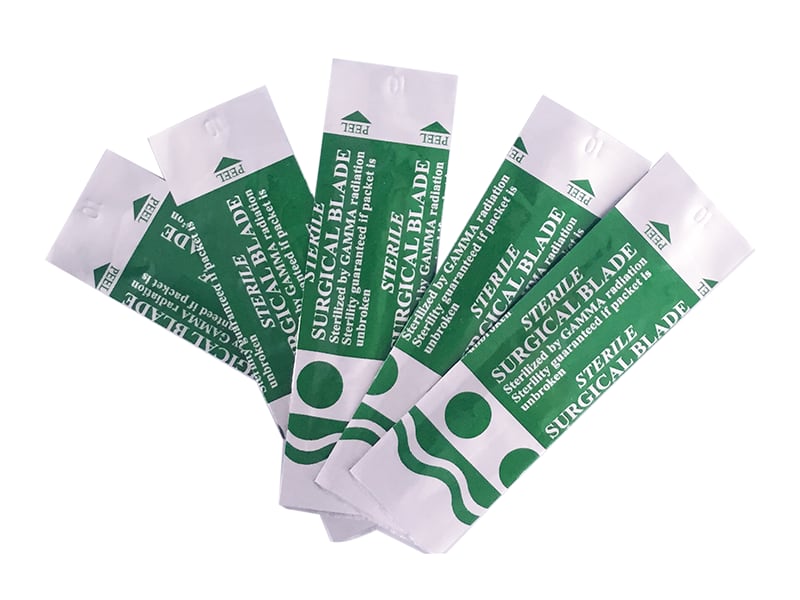 Each Surgical blade is hallmarked. Available size From Nº10~ Nº36(See below Blade sizes & Shapes Chart). Each blade is individually packed in aluminum foil. Blades are ultrasonically cleaned prior to packaging. Sterilized by Gamma Radiation 25KGY.