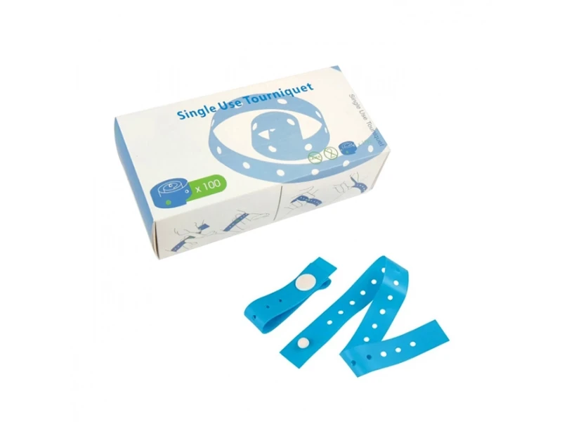 Button Tourniquet: Tourniquet with Button Fastening, made of TPE, latex free, and single-use in blood collection to control blood flow in hospitals or clinics.